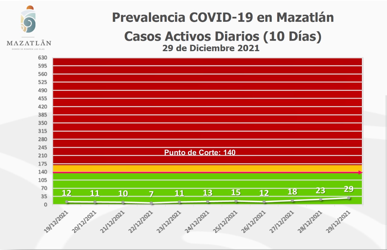 Cristian Castillo López, encargado de Protocolos y Sanidad del Gobierno Municipal, dijo que con esta cifra, Mazatlán continúa en color verde del Semáforo Epidemiológico Estatal y del Termómetro del Ayuntamiento, que hoy se ubicó en los 3.2 grados Covid.