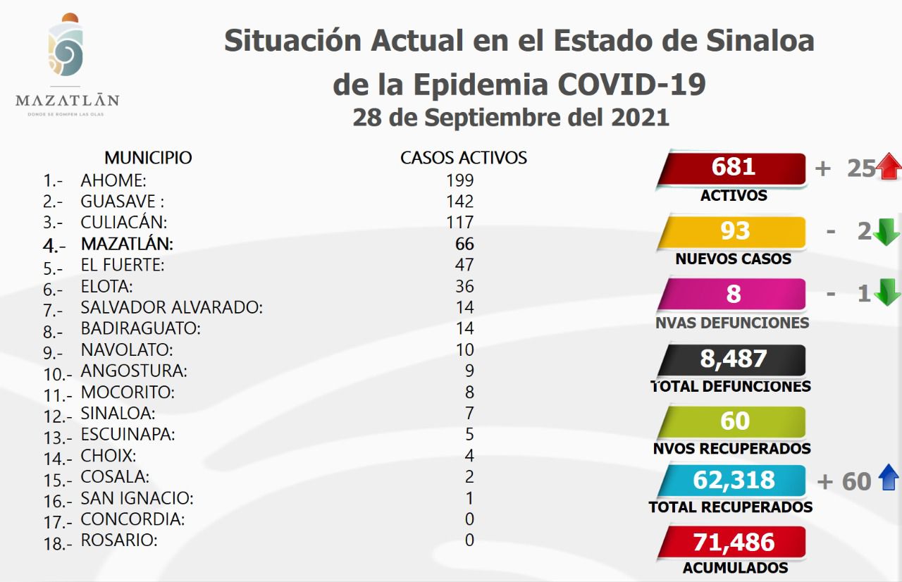 Agregó que Ahome tiene 199 casos activos, Guasave 142 y Culiacán 117.